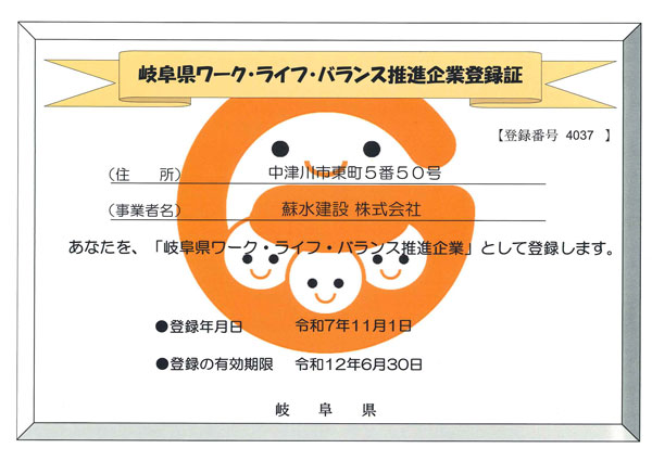 「岐阜県ワーク・ライフ・バランス推進企業」として登録されました 2025.10.27 蘇水建設株式会社は、仕事と家庭の両立を支援し、誰もが働きやすい職場環境づくりを推進している企業として、岐阜県より「ワーク・ライフ・バランス推進企業」に登録されました。これからも社員一人ひとりが安心して働ける環境の整備に取り組んでまいります。 ISO9001マネジメントシステム登録証を更新しまし...